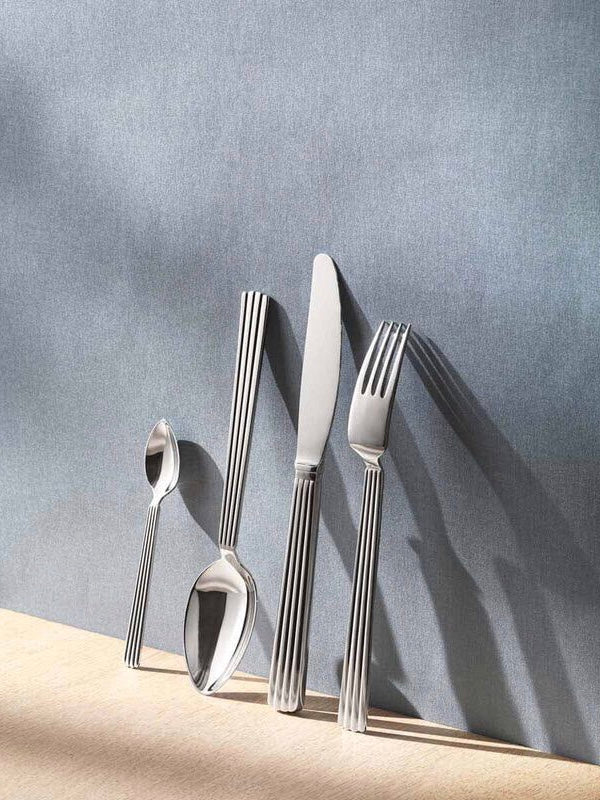 Die charakteristischen Rillen an den Griffen des Bernadotte Bestecks verleihen ihm nicht nur eine klassische Art-Deco-inspirierte Dekoration, sondern bieten auch eine gute Griffigkeit – ein perfektes Beispiel für Form und Funktion. Dieses 4er-Set aus hochglanzpoliertem Edelstahl ist der perfekte Anfang für den Aufbau einer größeren Kollektion.