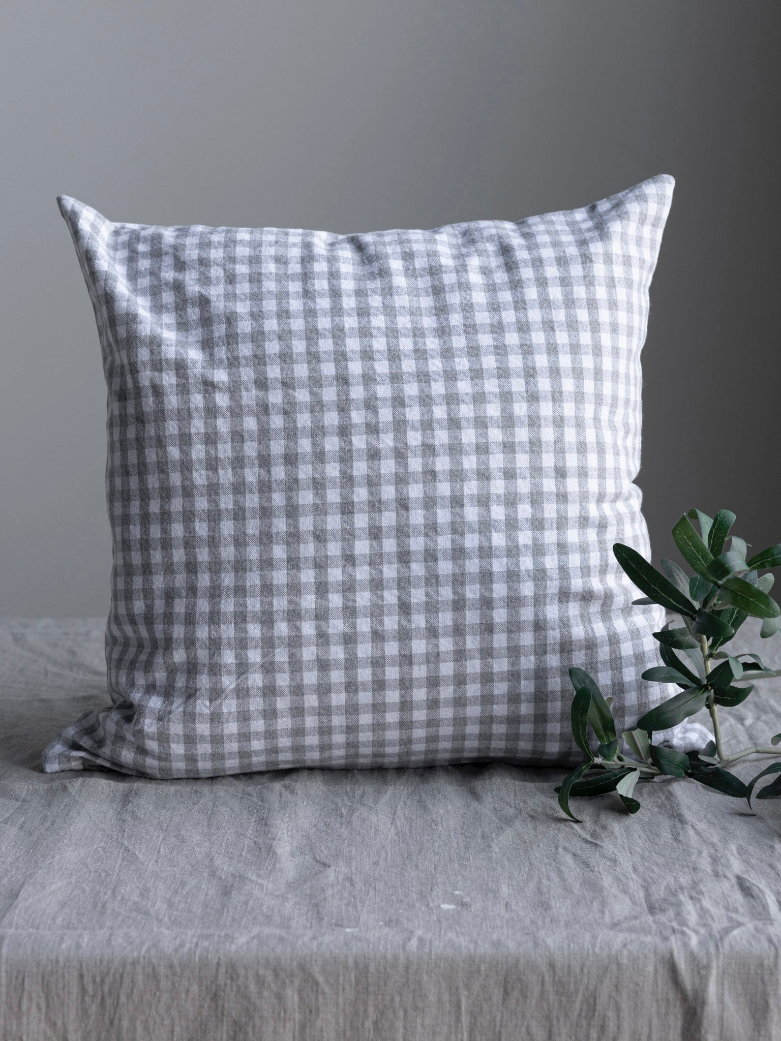 Schlichtes Dekokissen aus recycelter Baumwolle und Kunstfaser mit einem kleinem Karomuster. Leicht körnige Oberfläche. Mit verdecktem Reißverschluss gearbeitet.
