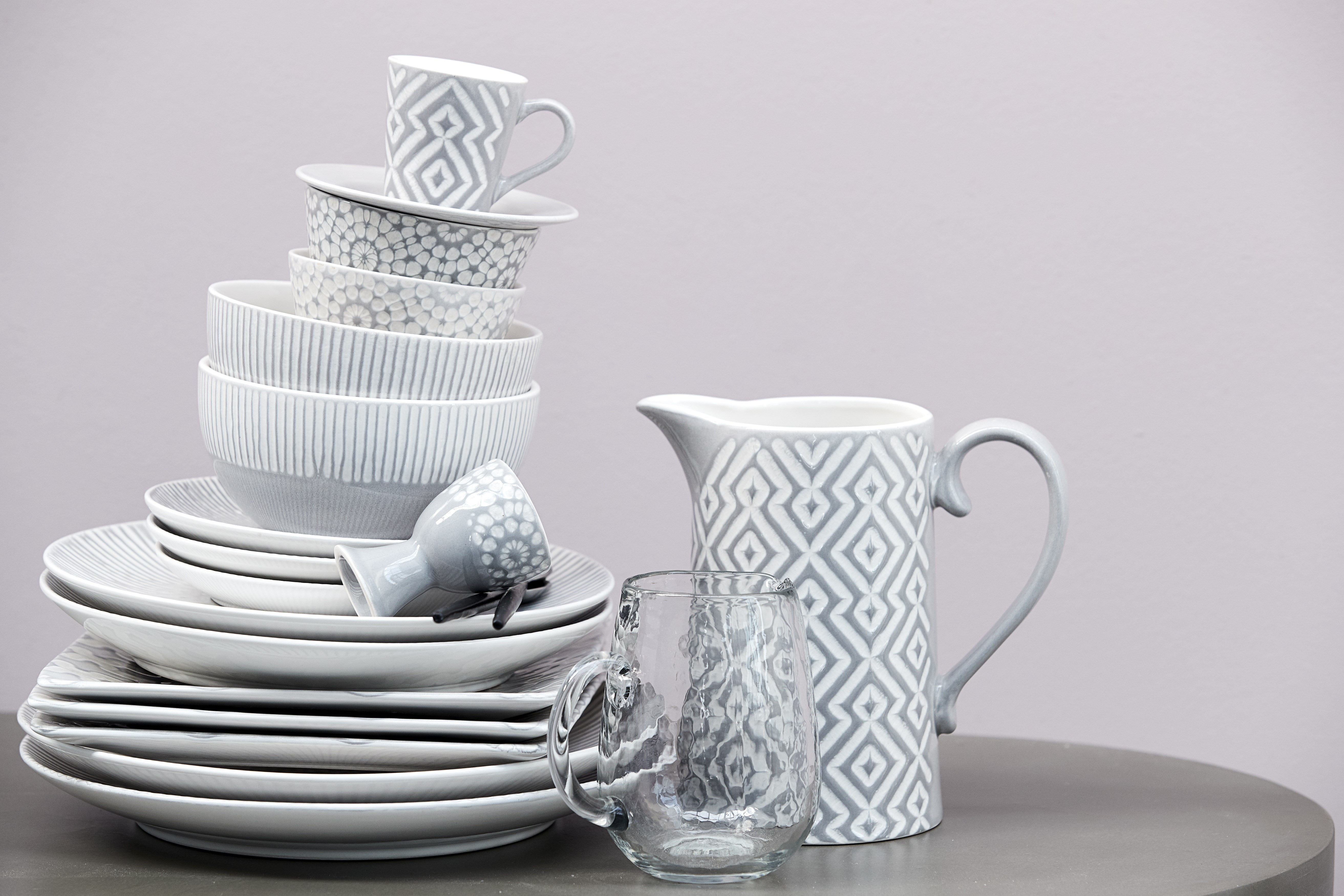 Espressotasse mit Untertasse der Serie Abella aus Keramik mit einem modernem geometrischen Muster in hellem zementgrau mit weiß. Weitere Teile der Serie werden ebenfalls angeboten.