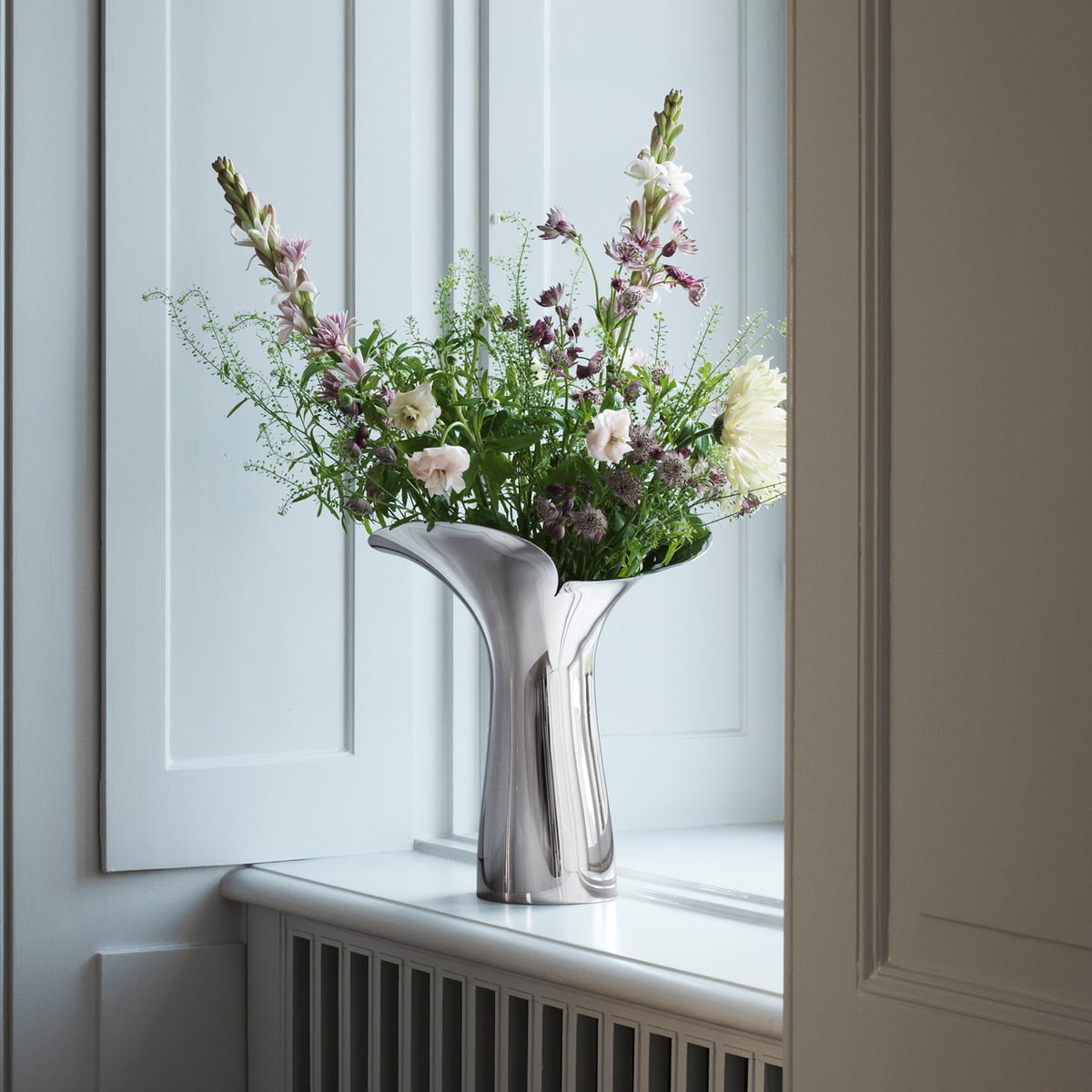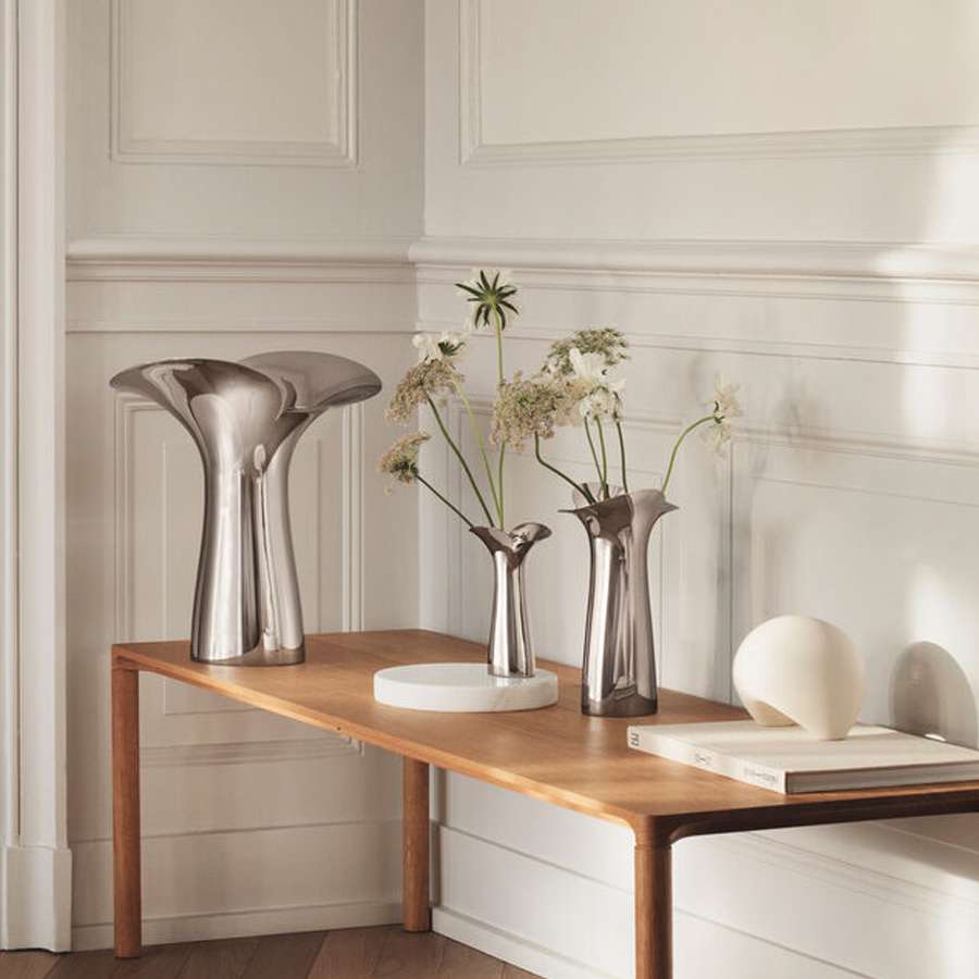 Diese minimalistische und organische Vase aus Edelstahl ist inspiriert von dem Augenblick, in dem sich eine Blütenknospe öffnet und zum ersten Mal ihre Blütenblätter entfaltet. Diese Edelstahlvase fängt den Optimismus eines neuen Frühlings ein, auf den wir uns nach einem langen, dunklen Winter freuen und ist mit und ohne Blumen immer ein stilvoller Blickfang der Wohnung.