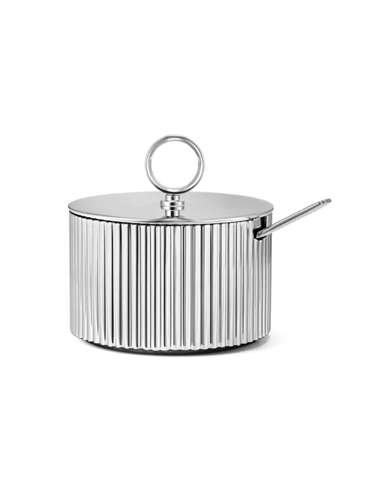 Die Bernadotte Zuckerdose wird einschließlich Löffel verkauft. Alle Teile bestehen aus Edelstahl.